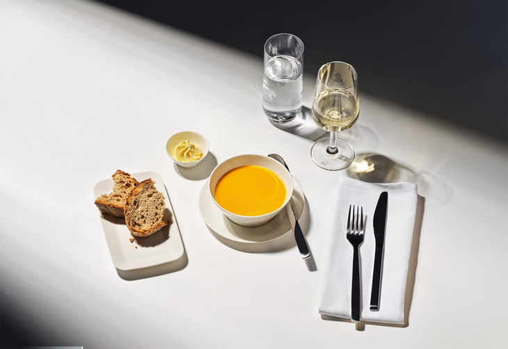 Nach Erreichen der Reiseflughöhe wird mit dem typisch schweizerischen Apéro gestartet, der neu nicht nur Nüsse, sondern auch frische Häppchen wie beispielsweise Oliven bietet. Mit dem exklusiv für die Swiss kreierten Cocktail «Swiss Alpine Essence», der ebenfalls in der First Class serviert wird, steht zudem ein weiteres Getränk auf der Karte. Das Menu wurde durch einen zusätzlichen Suppengang erweitert. Eine grössere Auswahl an Käse und Desserts sowie das neue Praliné-Angebot von Aeschbach Chocolatier runden den Service ab.