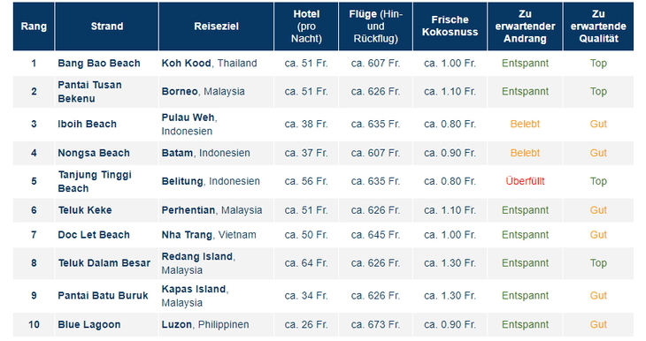 Bewertet wurden nicht nur Wasser- und Sandqualität, sondern auch Hotelpreise, Verpflegungskosten und Besucherandrang. Das Ergebnis zeigt: Reisende auf der Suche nach Sonne, Meer und Ruhe finden in Südostasien noch immer ihr Paradies – und das zu erstaunlich fairen Preisen.