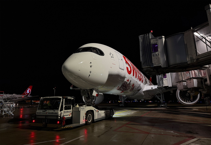 Wie es der Zufall will, fällt mit dem Jungfernflug auch der erste Schnee am Flughafen. Und das heisst vor allem eines: Das Flugzeug muss vor dem Start enteist werden. Aufgrund voll ausgelasteter De-Icing-Stationen hebt der Flug mit etwas Verspätung um 18:37 Uhr in Zürich ab. Nach 7 Stunden und 53 Minuten landet die Maschine mit der «Wanderlust»-Beklebung in Boston. Neben der US-Metropole – und bald auch Montreal – ist der A350 zu Schulungszwecken aber weiterhin noch auf der Kurzstrecke anzutreffen.