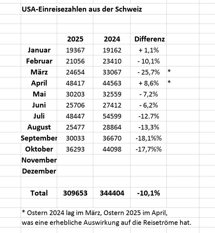 Insgesamt reisten in den ersten zehn Monaten des laufenden Jahres 10,1% weniger Schweizerinnen und Schweizerin die USA. Doch mit dem erheblichen Rückgang seit Juli dürften die Gesamtzahlen in den nächsten Monaten weiter zurückgehen. Die Gründe dürften zahlreich sein: ob US-Kurs des aktuellen Präsidenten, Zoll-Hickhack mit der Schweiz oder befürchtete Probleme bei der Einreise.