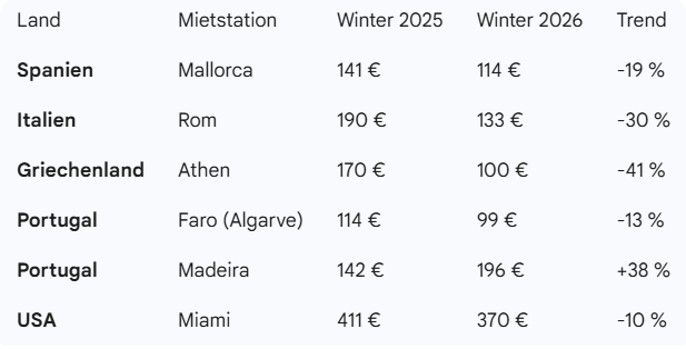 Innerhalb Europas sticht vor allem Madeira heraus. Die Atlantikinsel festigt ihren Ruf als Hochpreis-Destination: Hier kletterte der Wochenpreis gegen den Markttrend von 142 Euro auf 196 Euro. Auch wer zum Karneval nach Venedig möchte, muss tief in die Tasche greifen – hier werden für eine Woche über 200 Euro fällig.