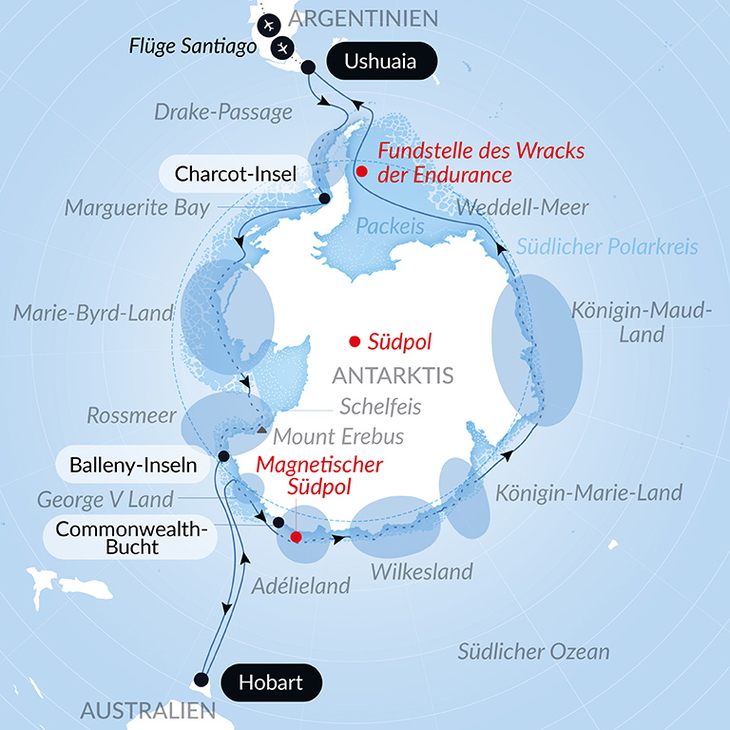 Die Expedition der Superlative erstreckt sich auf rund 23 000 Kilometer Küstenlinie. Die Route beginnt in Ushuaia (Argentinien) und führt über das Rossmeer bis nach Hobart (Tasmanien) und entlang der Ostküste der Antarktis zurück.
