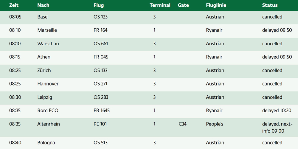 «Passagiere, deren Flüge abgesagt wurden, ersuchen wir, nicht zum Airport zu kommen», teilte der Flughafen Wien mit. Auch die Verbindung in die Schweiz ist betroffen: Mehrere Flüge der Austrian Airlines nach Zürich wurden bereits annulliert oder auf unbestimmte Zeit verschoben.