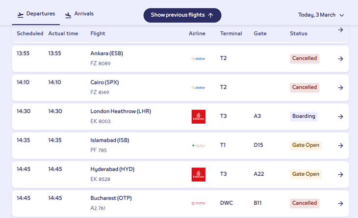 Die General Civil Aviation Authority der Vereinigten Arabischen Emirate hat die Durchführung von Sonderflügen an Flughäfen des Landes angekündigt, um gestrandeten Passagieren die Ausreise zu ermöglichen. Der erste Flug seit der Luftraumsperrung, der Etihad Airways-Flug EY67 nach London Heathrow Airport, startete am 2. März um 14.39 Uhr Ortszeit vom Zayed International Airport und landete um 19.16 Uhr GMT in London. Mehr als ein Dutzend weiterer Etihad-Flüge starteten von Abu Dhabi zu Zielen wie Amsterdam, Paris, Moskau, Mumbai, Delhi und Riad. Auch Emirates nahm Sonderflüge unter anderem nach London, Manchester, Paris, Amsterdam und Dschidda auf und kündigte an, Kunden mit bestehenden Buchungen vorrangig zu berücksichtigen. (3.3./10.50 Uhr)