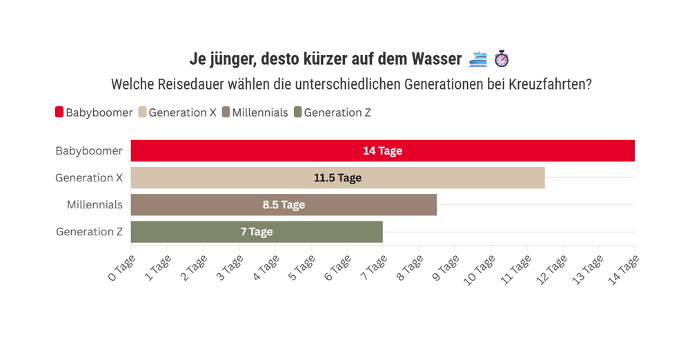 Die Babyboomer (Jahrgänge 1946–1964) sind und bleiben das Rückgrat der Branche. Mit einem Anteil von 44,5 Prozent aller Buchungen stellen sie fast die Hälfte der Gäste. Ihr Reiseverhalten ist geprägt von Musse und Kaufkraft. Eine durchschnittliche Cruise dauer 14 Tage, doppelt so lang wie bei der Gen Z.