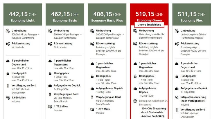 Der tiefste Langstrecken-Tarif wird als «Economy Light» bezeichnet und der nächsthöhere als «Economy Basic» – wie das Beispiel eines Fluges von Zürich nach Bangkok zeigt: