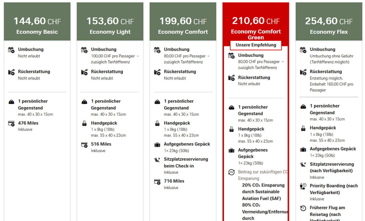 Die Preisunterschiede zum nächsthöheren Economy-Light-Tarif, der ein Handgepäck (55x40x23 Zentimeter) einschliesst und neuerdings für 100 Euro umbuchbar ist, sind gering, lässt sich feststellen. Kostet eine Strecke (one way) von Zürich nach Hamburg anfangs Juni 153.60 Franken in Economy Light, ist der Economy-Basic-Tarif mit 144.60 Franken nur 9 Franken günstiger. Auch nach London und Lissabon beträgt die Preisdifferenz nur 9 Franken.