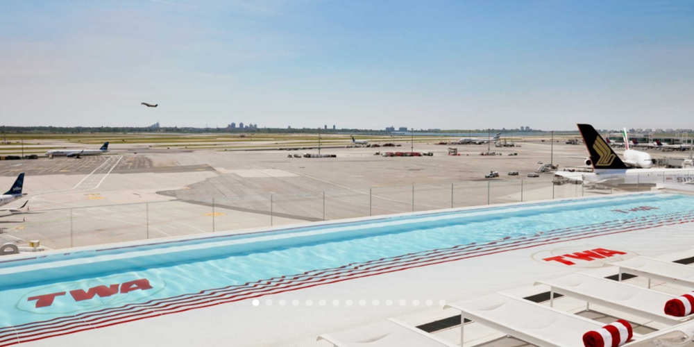 Der Infinity-Pool befindet sich auf dem Dach des TWA Hotel, welches sich im ehemaligen, von Eero Saarinen entworfenen TWA Flight Center im Terminal 5 befindet. Der Pool ist selber fast 20 Meter lang und befindet sich auf einer grossen Aussichtsplattform mit Platz für bis zu 300 Personen, welche 365 Tage im Jahr geöffnet ist. Wenn New York von garstigem Winterwetter heimgesucht wird, wird aus dem Pool nämlich kurzerhand ein «Poolcuzzi», mit Wasser, welches auf 35 Grad Celsius erwärmt wird.