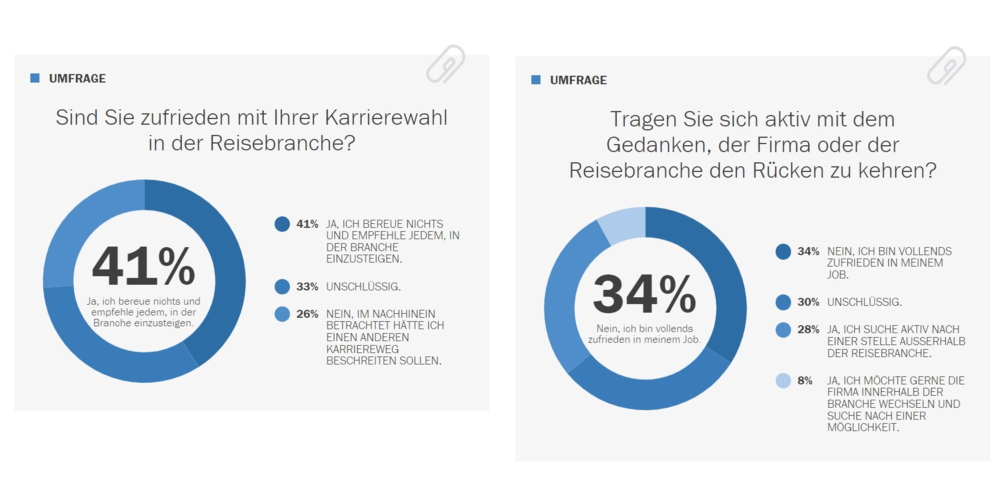 Eine erste Auswertung der «nackten Zahlen» liest sich - zumindest aus Sicht der Reisebranche selbst - eher ernüchternd. Auf die simple Frage, ob man mit der Karrierewahl in der Reisebranche zufrieden sei, antworteten 26% mit Nein und weitere 33% mit unschlüssig; diskussionslos zufrieden sind demnach weniger als die Hälfte der Antwortenden (41%). Happige 28% suchen derweil aktuell auch nach einer Stelle ausserhalb der Branche und 29% sind sich unschlüssig, ob sie beruflich «weiterschauen» wollen. 8% wollen innerhalb der Branche wechseln; aus welchem Grund lässt sich nicht eruieren. Und lediglich 34% geben an, vollends in ihrem Job zufrieden zu sein.