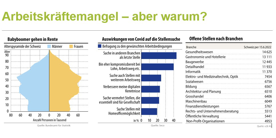 Oder anders formuliert: Die Schweiz zählt rund 5 Millionen Beschäftigte. In 10 Jahren sind es nur noch 4,5 Millionen. Wie sollen diese ersetzt werden? In den kommenden 10 Jahren müssen 10 Prozent der arbeitstätigen Bevölkerung ersetzt werden. Doch es rücken viel zu wenige Arbeitskräfte nach. Dieses Problem war eigentlich seit längerem bekannt, nun schlägt es durch. Der Fachkräftebedarf steigt rasant an, in fast allen Branchen.