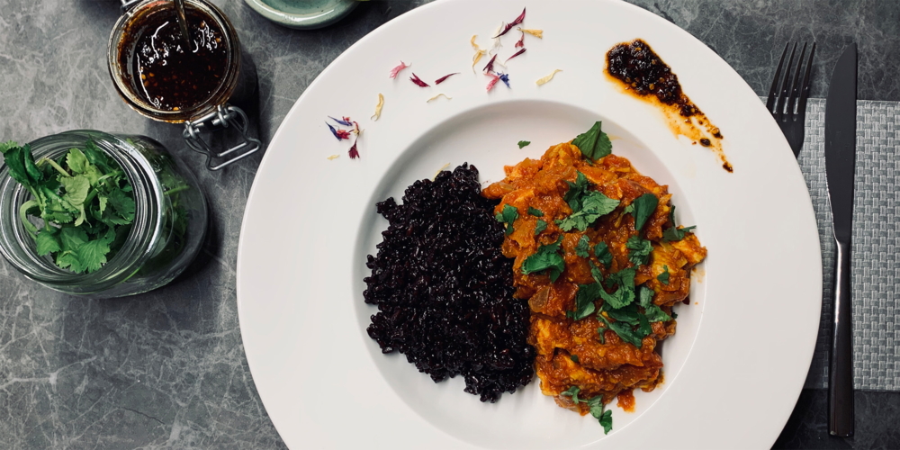 Als Beilage passt schwarzer Vollkornreis hervorragend. Mit Koriander und Limettensaft garnieren.