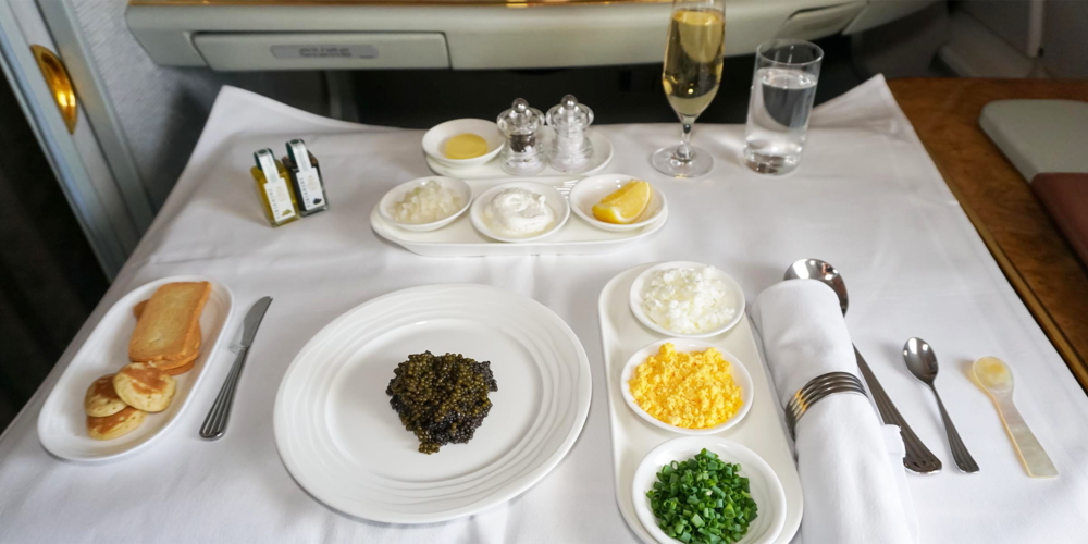 Kurz nach dem Start wird der Tisch für mich gedeckt, begleitet von Nüssen und dem ersten Glas Dom Pérignon 2013. Eine Flasche dieses Champagners kostet im Handel über 200 Franken. Als Starter entscheide ich mich für den Kaviar mit traditionellen Beilagen und frischem Brot. Den Kaviar gibt es nun auch wieder auf kürzeren Flügen.