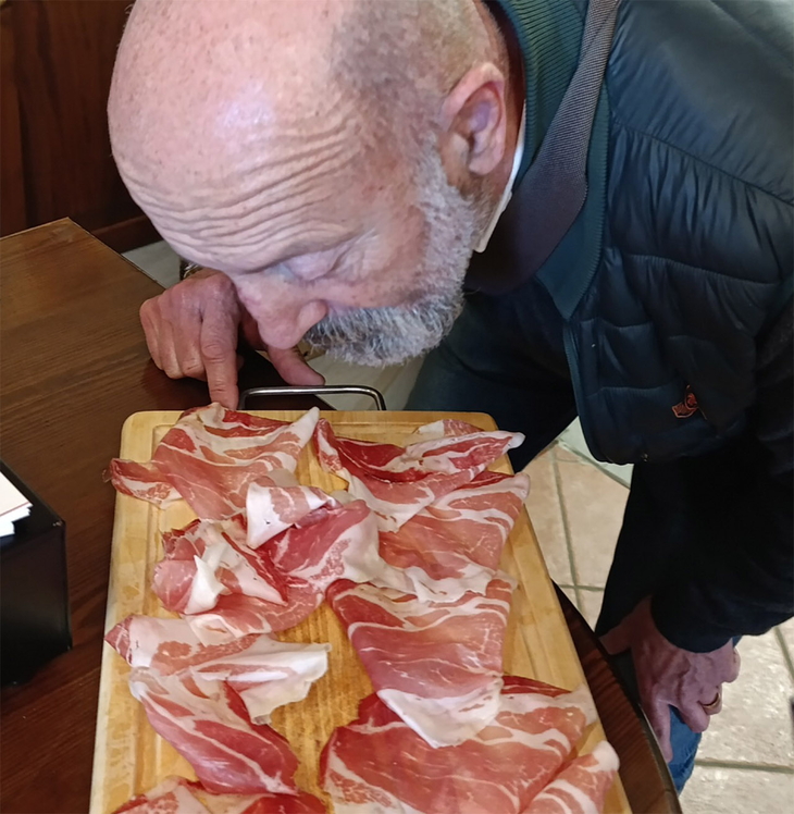 Ivan entschuldigte sich beim Caffè um 8 Uhr morgens, dass am Vorabend niemand richtig gekocht hätte. Dann stiegen wir ins Auto und fuhren zu Ernestino Carraglia, der am Vorabend nicht hatte dabei sein können, und schauten seine Produktionsräume an, alsbald, es war noch vor 10 Uhr, servierte er uns eine grosse Platte Spalla Cruda (Schulterschinken), begleitet von einem Wein ohne Etikette. Er sei von «Sotto la tavola» (von «unter dem Tisch»), sagte Ernestino im selben Tonfall wie andere «ein Mouton Rothschild 1988» sagen. Den Scherz kostete er mit strenger Miene aus und füllte die Gläser neu, schnitt seinen Wunderschinken erneut an und füllte die Platte zum zweiten Mal.