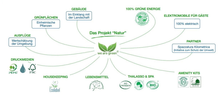 Bei unseren Produkten und Zulieferern bevorzugen wir stets die nachhaltige Alternative. In unserem Büro und in unseren Hotels bedrucken wir nur zertifiziertes Papier, wenn möglich, verzichten wir auf Ausdrucke. Unser Housekeeping verwendet ausschließlich Ecolabel-Produkte zur Reinigung und Pflege der Zimmer, auch unsere Amenity Kits sind zertifizierte Ecolabel-Produkte. In unseren sechs Thalasso SPAs verzichten wir auf Produkte mit Parabenen und wählen ausschließlich natürliche Varianten. Dabei schätzen wir die Aromen und Essenzen der sardischen Natur – Cannonau-Reben, Lavendel, Thymian und Olivenöl spielen hier eine grosse Rolle. Unsere Baumaterialien stammen aus der näheren Umgebung, und auch die Lebensmittel beziehen wir von lokalen Produzenten. Wir beziehen das Fleisch von Höfen aus den Bergen der Gallura, Fisch und Meeresfrüchte direkt von unseren Küsten und betreiben unsere eigenen Gemüsegärten mit freilaufenden Hühnern – gleichzeitig ein idealer Lernort für unsere kleinen Gäste.
