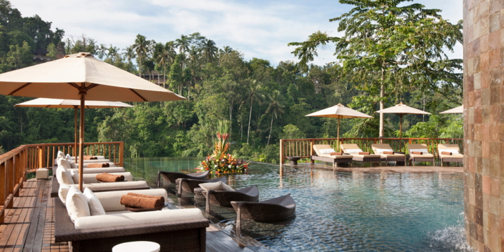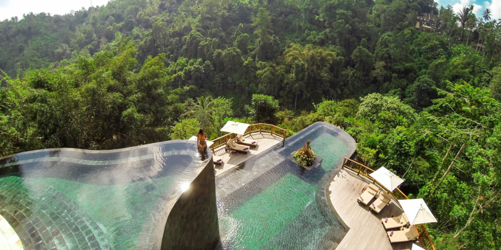 Im Zentrum der indonesischen Götterinsel Bali befindet sich das Künstlerstädtchen Ubud – umgeben von dichtem Urwald und tropischen Flüssen. Einen Pool der Extraklasse besitzt hier das Boutique-Hotel Hanging Gardens. Die Gäste blicken über das Becken hinaus in das dichte Grün des Dschungels, während sie das warme Wasser geniessen. Der grünlich schimmernde Pool befindet sich auf zwei Ebenen. Einer davon hängt kunstvoll in der Luft.