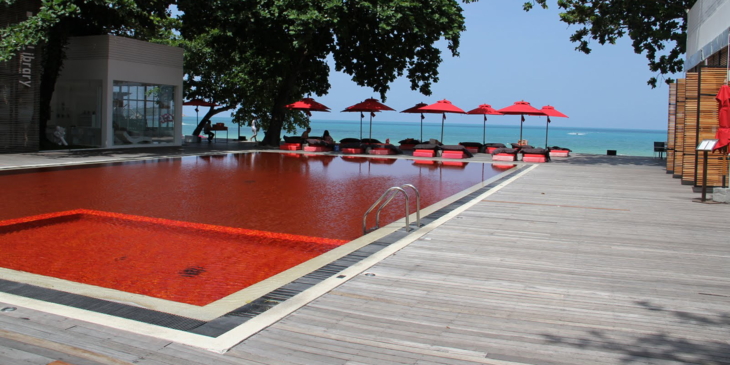 Das Hotel The Library ist an der Nordküste der thailändischen Ferieninsel Koh Samui zu finden. Im modern und eher sparsam ausgestatteten Resort sticht der knallrote Hotelpool besonders hervor. Ein Mosaik aus gelben, orangen und roten Steinen im Becken verleiht ihm einen ausgefallenen und einen eher aus einem Horrorfilm entsprungenen Look. Das Konzept scheint zumindest nicht abzuschrecken, denn auch in Marrakesch und in Sao Paulo gibt es Hotelanlagen mit blutroten Swimmingpools.