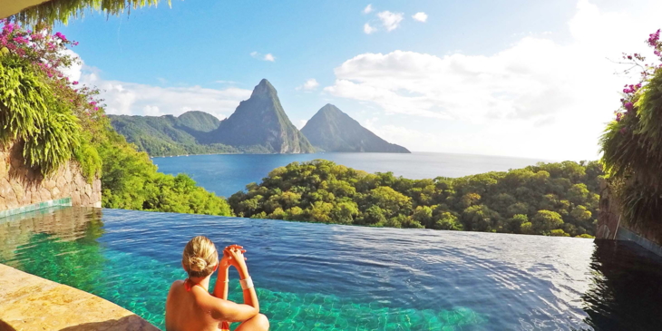 In der Karibik, auf der zu den Kleinen Antillen gehörigen Insel Saint Lucia, befindet sich das Hotel Jade Mountain. In diesem Resort verfügt jede Unterkunft über einen eigenen vierzig bis achtzig Quadratmeter grossen Swimmingpool – egal welche Kategorie man bucht, dieser Luxus ist überall garantiert. Herzstück der Anlage ist der grosse Infinity-Pool, in dem die Badegäste einen herrlichen Blick auf die beiden Vulkankegel Grand Piton und Petit Piton haben, die so typisch für die Karibikinsel sind.