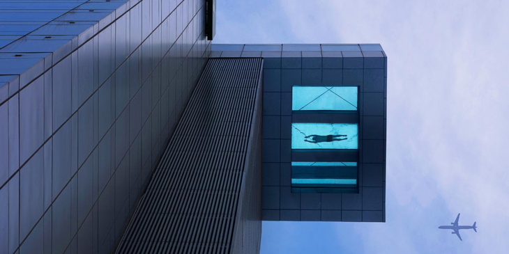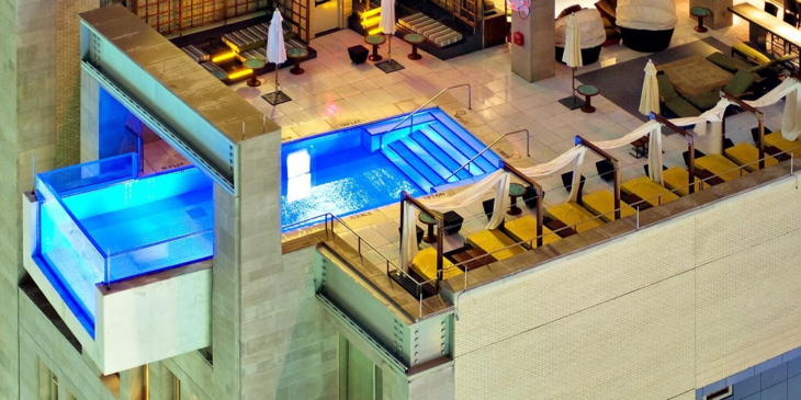 Das Holiday Inn liegt im aufstrebenden Wirtschafts-Bezirk Pudong in der chinesischen Metropole Shanghai. Auf der 24. Etage des Hauses befindet sich ein 30 Meter langer Indoor-Pool, der über das Gebäude hinaus ragt. In schwindelerregender Höhe geniessen die Badegäste den Blick über den Beckenrand die Strassenschluchten und schwimmen über die grossen Glasscheiben im Beckenboden mit direktem Blick in die Tiefe. Um den Ausblick durch den Glasboden und den ultimativen Adrenalin-Kick richtig zu erleben, empfiehlt sich eine Schwimmbrille.