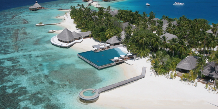 Das Huvafen Fushi befindet sich auf einer der rund 50 kleinen Inseln im Nord-Malé Atoll der Malediven. Der T-förmige Infinity-Pool in der hoteleigenen Bucht scheint direkt in den Indischen Ozean überzugehen. Bei Nacht erweckt die punktuelle Beleuchtung des Beckens den Eindruck, als würden sich unzählige Sterne im Wasser spiegeln. Im Unterwasser-Spa geniessen die Hotelgäste den beruhigenden Ausblick ins Meer.