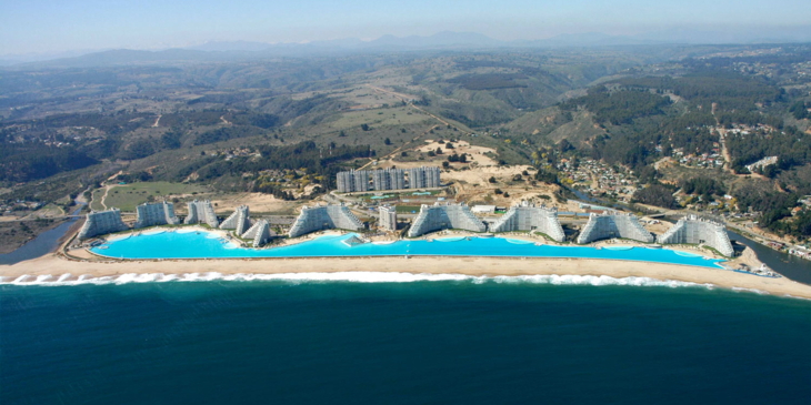 Wem herkömmliche Schwimmbecken schlichtweg zu klein sind, der sollte nach Lateinamerika fliegen. Denn der grösste Pool der Welt, der es auch ins Guinness-Buch der Rekorde geschafft hat, liegt an der Pazifikküste von Chile – rund 100 Kilometer südlich von der Hauptstadt Santiago entfernt in der Stadt Algorrobo. Hauptattraktion dieser Ferienstadt mit Amphitheater und zahlreichen Hotelkomplexen ist der riesige Pool des 2006 eröffneten San Alfonso del Mar Resort, welcher sich parallel zum Strand auf 1013 Meter Länge erstreckt.