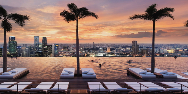 Das Hotel Marina Bay Sands liegt gegenüber dem Finanzdistrikt von Singapur und begrüsst mehr als eine Million Gäste pro Jahr. Dank seines faszinierenden Äusseren, bestehend aus drei 55-stöckigen Hoteltürmen, die auf 191 Meter Höhe einen 340 Meter langen Dachgarten tragen, gehört es zu den beliebtesten Hotel-Fotomotiven der Welt. Ein weiterer Grund für den Besucher-Ansturm: Der Infinity-Pool. Auf dem Deck in 200 Metern Höhe erstreckt sich der Pool über 146 Meter. Während die Hotelgäste hier ihre Bahnen schwimmen, geniessen sie einen beeindruckenden Blick über die Skyline von Singapur. Demnach ist auch der Titel «Swim on top of the world» naheliegend.