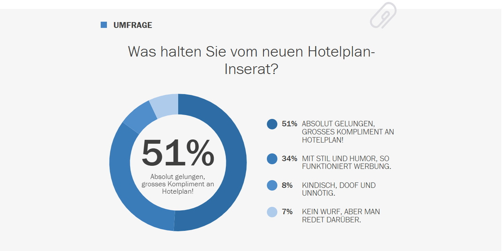 Gleich 647 Antworten gingen bei uns auf unsere Umfrage ein. Und das Verdikt ist klar: die Inserateaktion erhält grossen Applaus. 51 Prozent finden «Absolut gelungen, grosses Kompliment an Hotelplan!», 34 Prozent sagen «mit Stil und Humor, so funktioniert Werbung», 8 Prozent finden die Aktion «kindisch, doof und unnötig» und für weitere 7 Prozent ist das Inserat zwar «kein Wurf, aber man redet darüber».