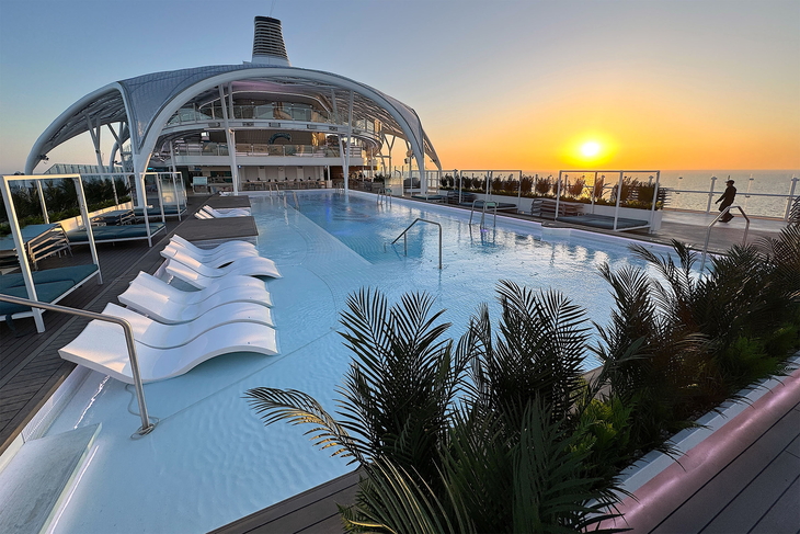 Auch die oberen Decks wurden, laut Reedereiaussagen aufgrund von Kundenwünschen, optimiert. Zwar gibt es den für alle TUI-Schiffe typischen und industrieweit nach wie vor einzigartigen 25-Meter-Pool. Ein klassisches und auf den meisten Kreuzfahrtschiffen vorhandenes darüberliegendes rundumlaufendes Aussendeck mit zusätzlichen Liegestühlen findet sich dagegen nicht mehr. Stattdessen sind die Flächen für Liegestühle auf mehrere Ebenen verteilt. Ein geschwungenes, semitransparentes Dach dient jetzt als Wetter- und Sonnenschutz. So genau weiss ich allerdings noch nicht, was ich von dieser Konfiguration halten soll.