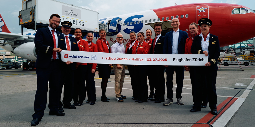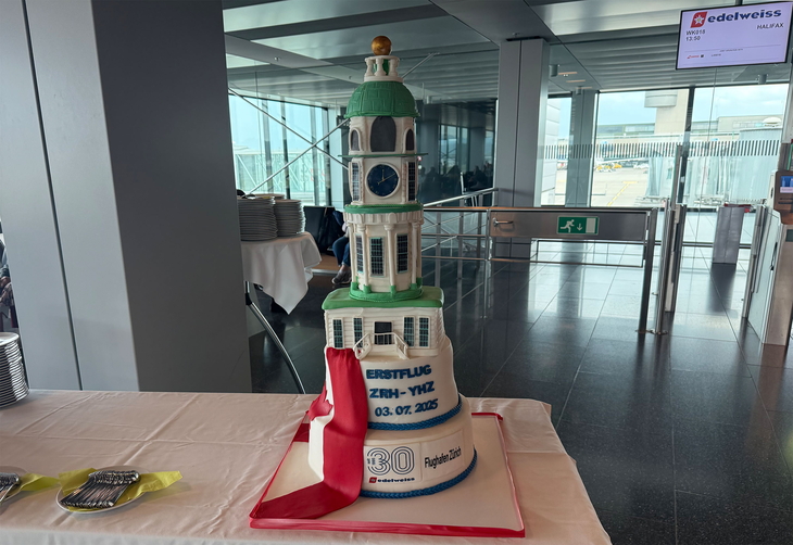 Am Donnerstagnachmittag (3. Juli) startete die Edelweiss zum ersten Mal in Richtung Halifax. Bei der feierlichen Zeremonie am Flughafen Zürich durften ein imposanter Kuchen und der traditionelle Ribbon Cut nicht fehlen: Patrick Heymann, Chief Commercial Officer von Edelweiss, und Rolf Hancock, Vice President Aviation Development des Flughafens Zürich, durchschnitten gemeinsam mit der Crew das Band und eröffneten die neue Strecke. Viele Passagiere des Erstflugs konnten das Anschneiden des Kuchens kaum erwarten und freuten sich über ein Stück der Torte mit der «Old Town Clock» von Halifax.