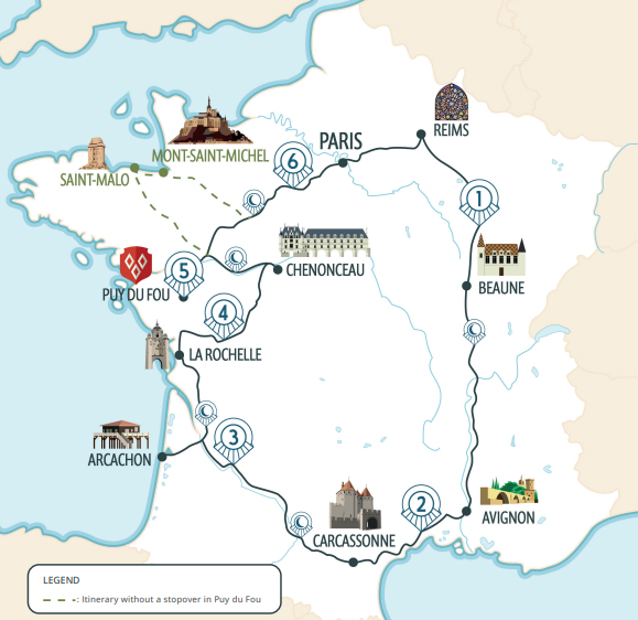 Die Route beginnt am Pariser Gare de l’Est und führt auf über 4000 Kilometern durch das Herz des Landes. Stationen sind unter anderem Reims, Avignon, die mittelalterliche Stadt Carcassonne, La Rochelle, der Puy du Fou-Park sowie die Bretagne mit Zwischenstopps in Saint-Malo und beim Mont-Saint-Michel. Am sechsten Tag endet die Reise wieder in Paris.