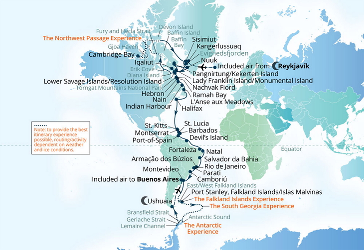 Die Reise beginnt mit einer Übernachtung in Reykjavik, gefolgt von einem Charterflug nach Kangerlussuaq in Grönland. Von dort startet das Abenteuer, das insgesamt 60 Expeditionstage in 14 Ländern und Regionen umfasst. Zu den Highlights gehören fünf Tage in der Antarktis, drei Tage in Südgeorgien, drei Tage auf den Falklandinseln sowie sechs Tage in der historischen Nordwestpassage.