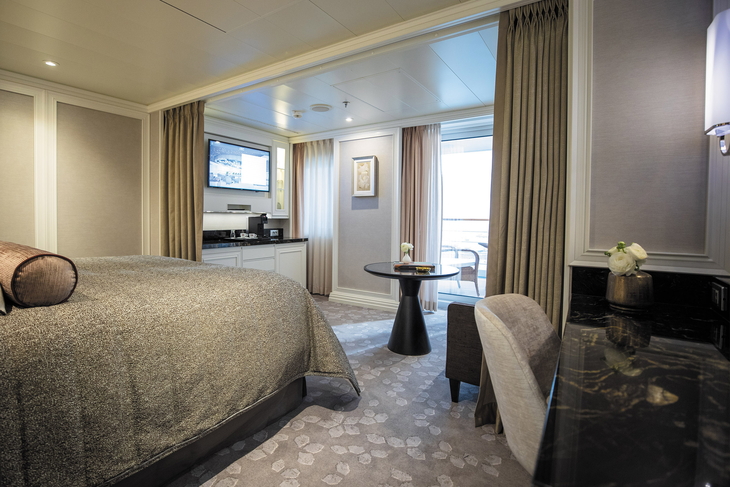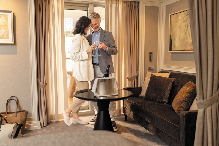 Zurück an Bord erwartet Ihre Kunden eine gehobene Suite als stilvoller, ruhiger Rückzugsort – ideal für entspannte Momente, einen Cocktail auf dem Balkon oder eine erholsame Nacht. Grosszügiger Raum, edle Materialien und durchdachte Details schaffen eine Atmosphäre, die zugleich luxuriös und einladend ist.