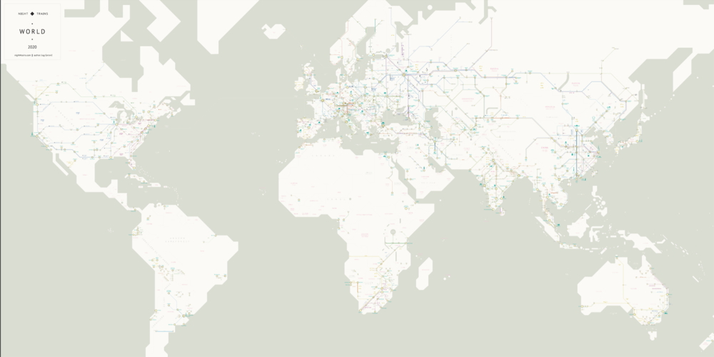 Beinahe auf der ganzen Welt gibt es Nachtzug-Verbindungen, die zwischen verschiedenen Grossstädten verkehren. Der französische Kartograph Jug Cerovic hat nach jahrelanger Arbeit das weltweite Netz illustriert und auf der Website www.night-trains.com veröffentlicht. Die Map gibt es entweder als komplette Weltkarte oder in kleineren Exemplaren, jeweils nach den Kontinent aufgeteilt.