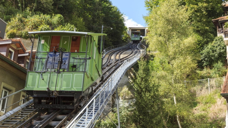 Das Funiculaire gehört zu den Sehenswürdigkeiten Freiburgs – und manchmal auch zu den Riechwürdigkeiten, sozusagen. Denn die 120-jährige Standseilbahn vom Stadtzentrum hinab in die Unterstadt wird mit dem Ballast städtischen Abwassers betrieben, das in der Bergstation eingefüllt und in der Talstation wieder abgelassen wird. Die Bahn ist im Inventar der nationalen Kulturgüter verzeichnet. www.tpf.ch/funiculaire