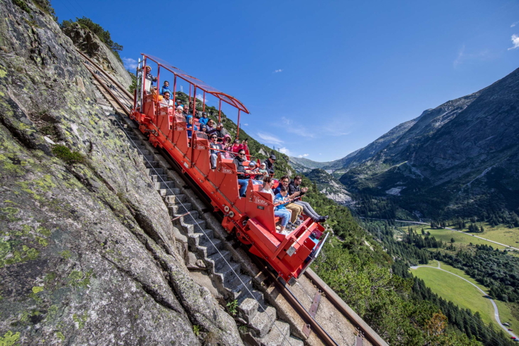 1926 wurde die Gelmerbahn für den Bau einer Staumauer und der Wasserzuleitung zum Kraftwerk Handeck im bernischen Haslital gebaut. 2001 wurde sie erneuert und für den öffentlichen Betrieb zugelassen. Die Fahrt im offenen Wagen vermittelt Achterbahn-Feeling: Die Bahn weist an der steilsten Stelle eine Steigung von 106 % auf und war bis 2017 Europas steilste Standseilbahn. Dann wurde sie von der Stoosbahn im Kanton Schwyz entthront, die bis zu 110 % steigt – allerdings mit geschlossenen Wagen. www.grimselwelt.ch