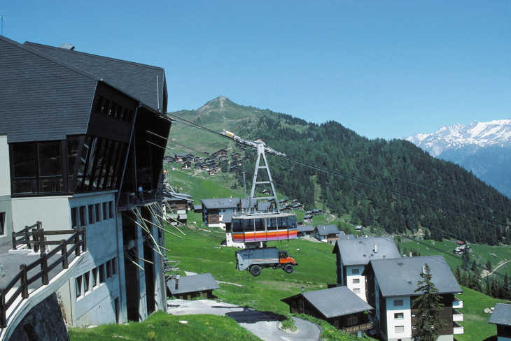 Die Luftseilbahn von der Station Betten der Matterhorn-Gotthard-Bahn im Oberwallis hinauf auf die Bettmeralp auf 1850 m.ü.M. transportiert alles, denn auf die Alp führt keine Strasse. So wird auch der Kehricht-Lastwagen an die 120-Personen-Kabine geschnallt und so hinauf auf die Alp und nach getaner Arbeit wieder ins Tal befördert. www.aletscharena.ch