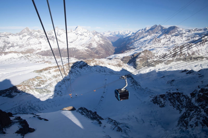 Der neue «Matterhorn Glacier Ride» auf das Klein Matterhorn oberhalb von Zermatt kann bis zu 2000 Passagiere pro Stunde befördern, und zwar hinauf in die höchste Bergstation der Alpen: Sie wirkt wie ein angeklebtes Riesenvogelnest aus Beton und liegt auf 3820 m.ü.M. (Die Jungfrau-Zahnradbahn fährt «nur» auf 3454 m.ü.M.) Die Bahn besteht aus 25 Kabinen mit je 28 beheizten Sitzplätzen; das Design stammt von Pininfarina. www.zermatt.ch