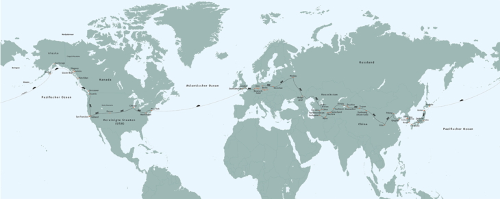 Startpunkt ist in Köln am 12. August 2020. Die Route führt via London und New York quer durch die Vereinigten Staaten und Kanada, von dort nach Japan, Südkorea und China, durch die Wüste Gobi über die Seidenstrasse nach Russland und schliesslich via Polen nach Berlin. Ankunft dort ist am 23. Oktober 2020.