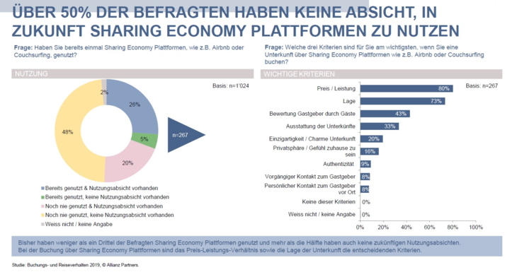 Im Vergleich zu anderen Ländern scheint die Schweiz derweilen beim Thema «Sharing Economy» eher noch Zurückhaltung zu üben. 31 Prozent haben demnach bereits Erfahrung mit Sharing-Plattformen gemacht, währenddessen knapp die Hälfte aller Befragten noch nie darüber gebucht haben und auch nicht beabsichtigen, solche Plattformen zu nutzen. Bei den aktiven Nutzern von Sharing Plattformen ist das Preis/Leistungsverhältnis als auch die Lage der Unterkünfte ein Hauptkriterium, währenddessen der persönliche Kontakt zu Gastgebern vor Ort oder die Authentizität eine untergeordnete Rolle spielen.