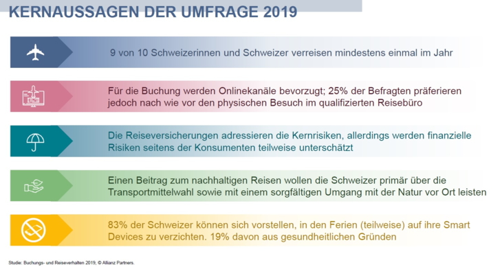 Bereits zum 25. Mal in Folge hat die Versicherungsgesellschaft Allianz Partners eine grosse Reisestudie in Zusammenarbeit mit dem Schweizer Reise-Verband (SRV) und dem Institut Link in Luzern durchgeführt. Zum Jubiläum wurde die Reisestudie mit aktuellen Themen wie Reiseverhalten rund um Nachhaltigkeit und Umwelt sowie Digitale Abstinenz (Digital Detox) ergänzt. Zwischen dem 8. und 19. Juli 2019 wurden dafür insgesamt 1024 Interviews schweizweit durchgeführt, wie Olaf Nink, seit dem 1. Juli CEO von Allianz Partners, bei der Präsentation bekanntgibt.