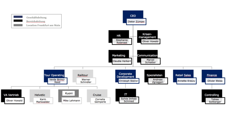 Per Mitte August wird in der Geschäftsführung von Kuoni Schweiz ein neues Ressort geschaffen, das Verda Birinci-Reed leiten wird. Ihr unterstehen vier Bereiche: 1. Helvetic Tours mit Leiterin Karin Markwalder. Das kleine Team bleibt unverändert. Der Produktaufbau wurde bisher schon aus Köln bestritten. 2. Das Kuoni-Produktionsteam in Frankfurt, das unter der Leitung von Mike Lehmann stehen wird, der ein erfahrener Product Manager von Meiers Weltreisen ist. 3. Der Veranstalter-Vertrieb, der von Oliver Howald geleitet wird. Ihm unterstehen das Call-Center in der Schweiz, die Agentenbetreuung, das Key Account Management und die Verkaufsförderung. 4. Kuoni Cruises mit Cornelia Gemperle.