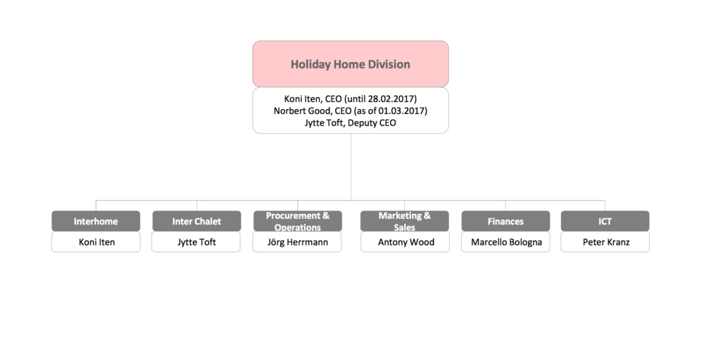 Neu werden für das Management der Holiday Home Division folgende Personen nominiert: Marcello Bologna (bisher CFO Interhome) für Finanz-Belange, Peter Kranz (bisher CIO Inter Chalet) für den Bereich Informationstechnologie, Jörg Herrmann (bisher Leiter Marketing & Vertrieb Interhome) für den Bereich Einkauf & Operations und Antony Wood (bisher Leiter Marketing, Vertrieb & Neue Medien Inter Chalet) für die Departemente Marketing & Vertrieb.