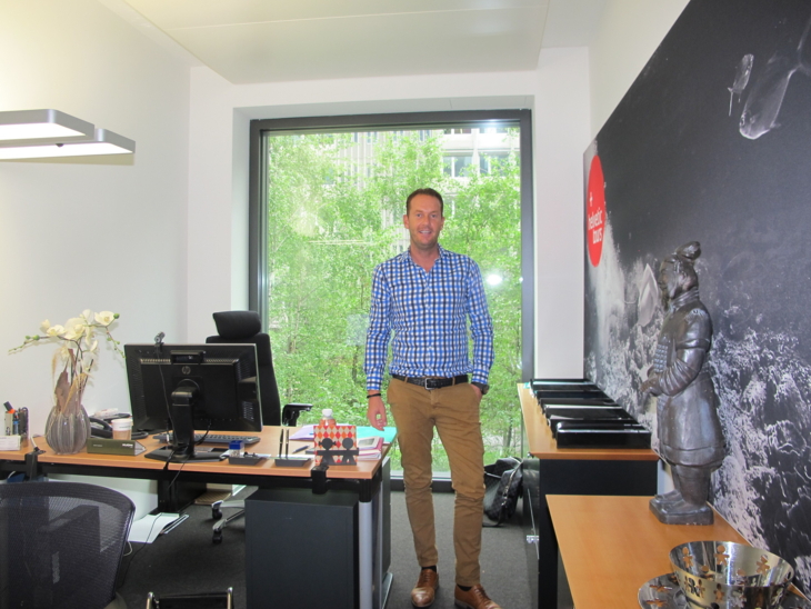 Was weiter auffällt: Es gibt nur noch sehr wenige Einzelbüros und auch diese sind im Vergleich zu vorher eher klein. Die Hierarchiestufen durchmischen sich besser; die Abteilungen sind nicht mehr so deutlich voneinander getrennt. Bild: Oliver Howald ist einer von nur noch wenigen, welche ein Einzelbüro haben - wobei dort die Platzverhältnisse enger sind als in vielen Einzelbüros an der Neuen Hard. Doch auch Howald freut sich über den schönen neuen Ausblick.