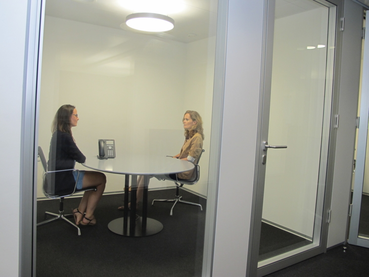 Meetingräume werden geteilt; in kleinen, abgeschotteten Räumen mit Glastüren, neudeutsch «Shelters» genannt, kann man auf Wunsch auch Meetings im kleinen Rahmen abhalten (im Bild unten halten Stephanie Hiltpold und Pavla Anderhub gerade ein kleines Gespräch unter vier Augen) oder ein Telefonat im Stillen führen. Obwohl nun etwas mehr «Grossraumbüro-Atmosphäre» herrscht, trotz kleinerer Gesamtfläche, ist es relativ ruhig. Ein paar Plätze sind ferienbedingt unbesetzt und bei Vollbelegung kann es sicherlich auch mal etwas lauter werden, grundsätzlich ist die Akustik aber überraschend gut. Zudem gibt es kein Rauschen der Lüftungsanlage mehr.