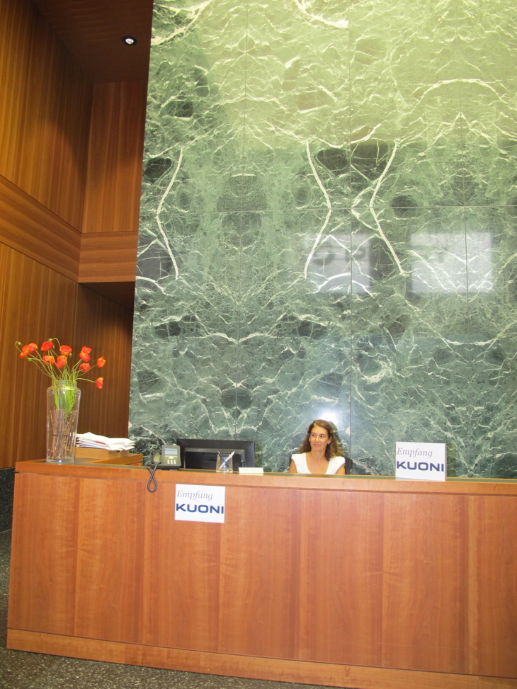 Bekanntes Gesicht, neues Umfeld: Cristina De Marco begrüsst die Besucher in einer grosszügigen und schönen Empfangshalle, auch wenn diese jetzt mit dem Empfang von Pöyry geteilt wird – die Beratungsfirma besetzt die andere Hälfte des neuen Bürogebäudes. Wobei hier anzumerken ist, dass IT, Finanzen und ein paar Spezialisten von DER Touristik Suisse in einem anderen, benachbarten Gebäude untergebracht sind.