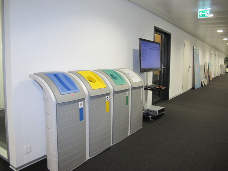 Kübel oder Papierkörbe sucht man vergebens – dafür gibt es jetzt auf jedem Stockwerk an mehreren Orten Recycling-Stationen (siehe Bild) – gute Initiative! Auch die Anzahl Drucker wurde reduziert, indem mehr Abteilungen dieselben Drucker nutzen. Man merkt: Hier wurde auf Effizienz getrimmt, unnötigen Luxus leistet man sich nicht mehr.