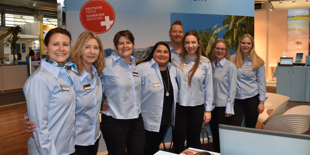 Das Messeteam von TUI Suisse, von links: Katrin Jakopitsch, Monique Sassine, Martina Schaffner, Antonella Chieffo, André Juchli, Lorena Miotto, Tanja Vonderschmitt und Nina Calonder. Bild: TN