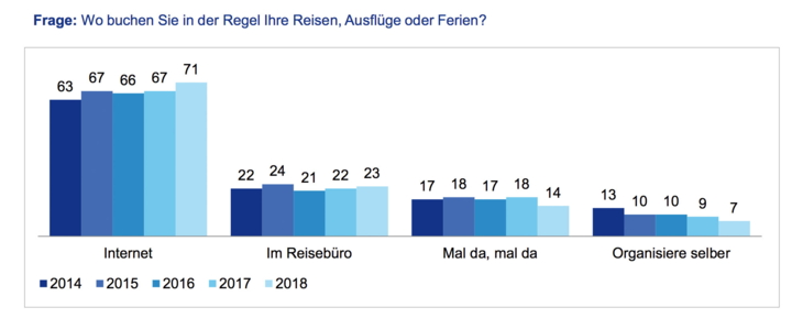 Es zeigt sich, dass die Schweizer Bevölkerung vermehrt je nach Art der Reise entscheidet, welchen Online-Kanal (Direkt, Portale, Reisebüro, Sharing-Economy-Plattform) sie dazu verwendet. Verstärkt werden auch Websites der Reisebüros bevorzugt (+2%).