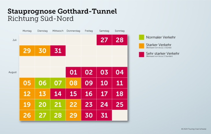 Bereits am Wochenende vom 27. und 28. Juli startet der Rückreiseverkehr in Richtung Norden. Am ersten und zweiten August-Wochenende könnte die Zehn-Kilometer-Staugrenze vor dem Gotthard-Südportal erreicht werden. Die längsten Wartezeiten werden zwischen Donnerstag und Montag erwartet.