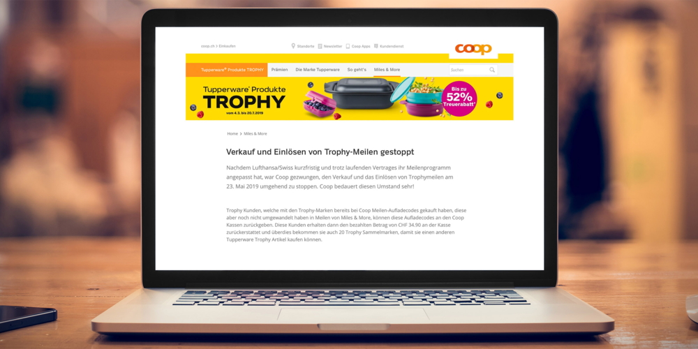Darüber hinaus lanciert der Grosshändler immer Mal wieder spezielle Sammelprogramme, von denen die Konsumenten profitieren können. So stellte Coop am 12. März das neuste «Trophy-Programm» in der Coopzeitung vor: Die volle Sammelkarten kann mit einer zusätzlichen Zahlung von 34.90 Franken gegen Vielfliergermeilen eingetauscht werden. Eigentlich sollte diese Aktion noch bis zum 20. Juli laufen, doch jetzt hat der Detailhändler auf seiner Website bekanntgegeben, dass per 23. Mai Schluss ist. «Nachdem Lufthansa/Swiss kurzfristig und trotz laufendem Vertrag ihr Meilenprogramm angepasst hat, war Coop gezwungen, den Verkauf und das Einlösen von Trophy-Meilen am 23. Mai umgehend zu stoppen.»
