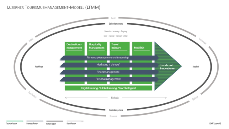 Was die Höheren Fachschulen für Tourismus unter ihrer Ausbildung verstehen, wird im «Luzerner Tourismus Management Modell» veranschaulicht: Eine umfassende Tourismusausbildung zu den verschiedenen Incoming- und Outgoingthemen. Diese werden mit den Kernelementen von Management und Leadership verbunden und in den Raumdimensionen von lokal bis international angesiedelt. Nachhaltigkeitsdimensionen, Staat und Technologie bilden die Basis des Modells und neben den inhaltlichen Aspekten spielen Persönlichkeitsmerkmale wie Selbst- und Sozialkompetenz eine wichtige Rolle.